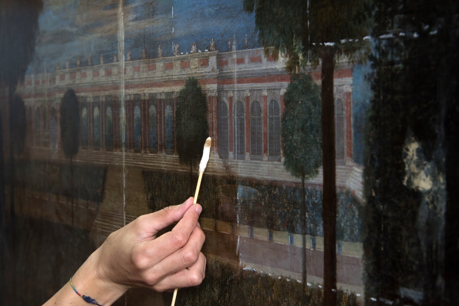 Restoration work on View of the Parterres of Trianon with Flore and Zephyr by Jean Cotelle.